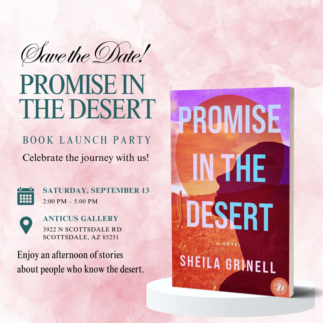 Promise in the Desert will be officially released into the world on Sept. 5, a day chosen by my publisher. “Too close to Labor Day for a party,” I thought. I approached a local book dealer with whom I had been chatting regularly about holding a launch event on Saturday, Sept. 13. She said “sure.”